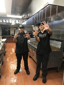 These team members are the amazing two crew members in this Wingstop. They do such a great job with this work. They listen and are respectful. The hand signs are the meaning of Wingstop. W for wing and the stop hand sign is for stop. So that makes Wingstop.